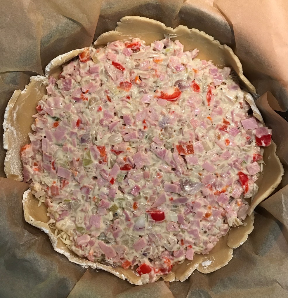 Oma torttutaikina: 4 salottisipulia pilkottuna, öljyssä letkeytettynä. Kinkkukuutiot käytin myös pannulla ja niitä oli noin 150 g (?), pilkottua paprikaa, creme fraichen pikkupurkki (jäänyt kaappiin). Näistä kuumentelin vähän nestettä vähemmäksi, lisäsin suolaa ja pippuria ja 2 valkosipulin kynttä. Hyvä tuli!