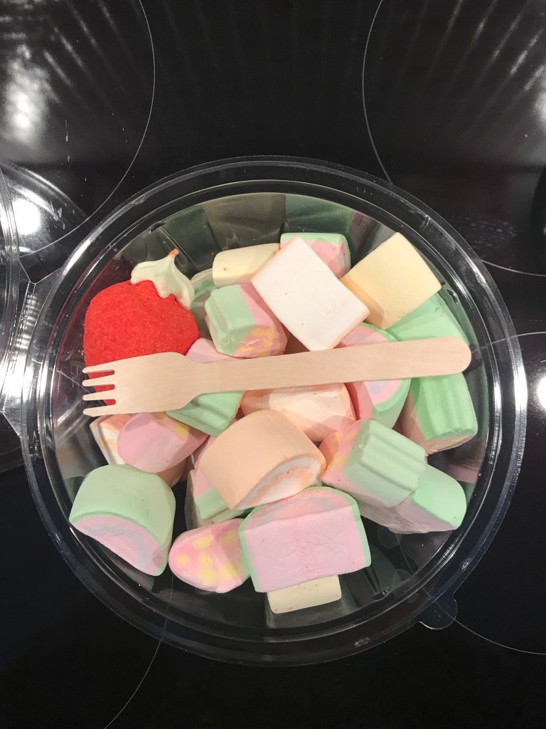 Näihin ilosanomiin jätän lukijani tarjoten hänelle maistiaiset eli pienet muistiaiset alla olevasta salaattikupista, jonka toin tänään kaupasta. Talonmies purki kassista tavarat ja laittoi sen -heh- epähuomioissa jääkaappiin luullen sitä salaatiksi. Sellaista se melkein onkin! Onhan se lähestulkoon ainoita karamellejä, joita anorektinen toverini salaatin lisäksi suostuu syömään. Nytpä ymmärrän tämänkin tuotteen kohdalla syyn. Se tuntuu isolta melliltä suussa, mutta hip-hei: kokoonsa nähden paljon vähemmän kaloreita kuin pikkuisessa suklaakonvehdissa. Että olokaappaten hyvät ja saa ottaa kaksikin!