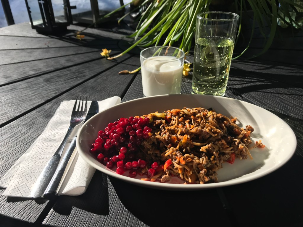 Jauheliha pannuun, ei rasvaa. Porkkanaraaste, valkosipuli, vähän keitettyä vettä estämään pohjaanpalamista ja höyrystämään, lihaliemikuutio murustettuna. Sitten nuudelit kämmenessä murskattuna, suolakurkut ja chili. Lopuksi mausteet. (Talonmiehellä näytti olevan Creme Fraiche-purkki jääkaapissa. Pyörittelin sitä käsissäni…ja laitoin takaisin, koska painonvartiointi. Paino on nyt jämähtänyt samoihin lukemiin, muttei haittaa. Alan olla kuosissani.)