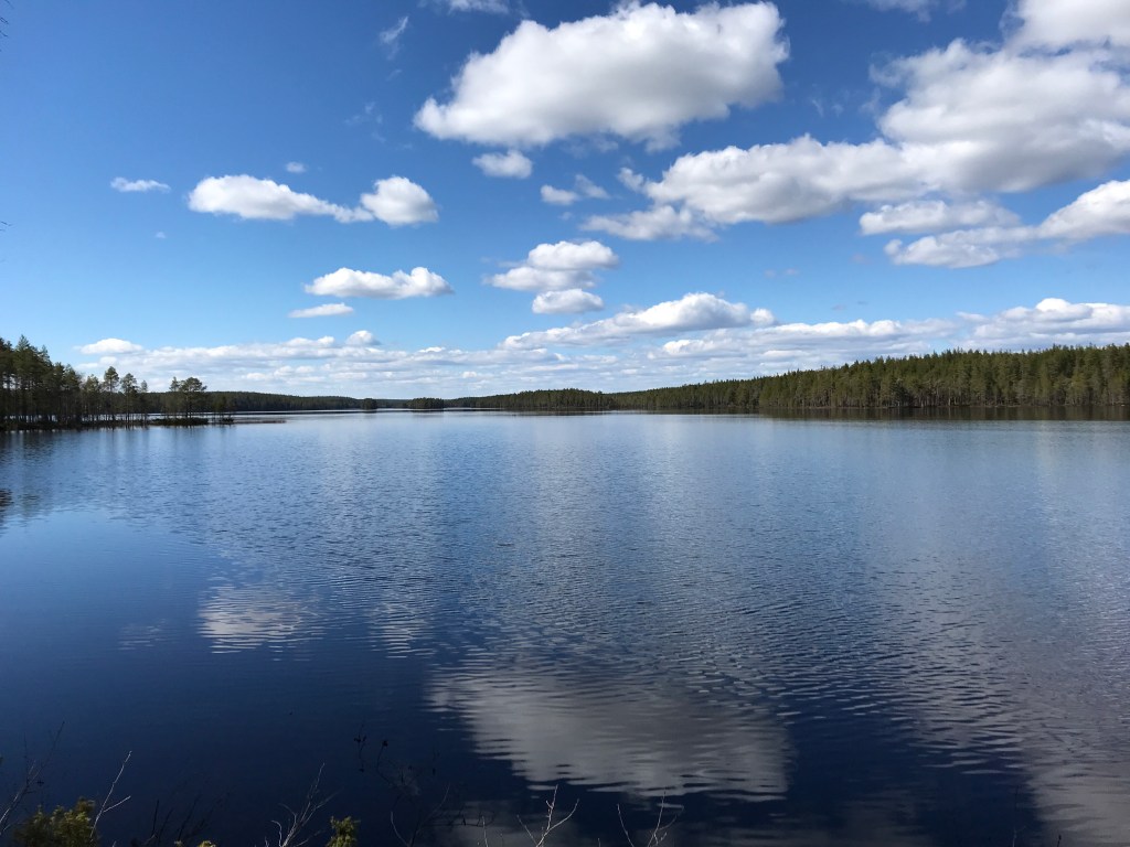 Mitä näin, mitä kuulin? Näin majavan, jonka näin viime vuonnakin samalla alueella. Liekö sama talttahammas? Olen meloessa raivaillut patokeppejä tuosta kohtaa kulkutieltäni joka vuosi. Tämä aluehan on mun vuosien takainen melontaretkeilyalue jo ennen mökinosotoa. Nyt oli saanut vähän isompaakin tulvaa aikaiseksi 🙂 joskin tulvaa on nyt ilman majaviakin. Kuulin järripeipon, peipon, kirjosiepon, korpin, lokkeja, tiiroja… ainakin nämä. Joku kulki samoja reittejä, koskapa mennessä polulla havaitsemani iso korvasieni, jonka aioin palatessa poimia kyytiin, oli poljettu littanaksi. Varmaa on, ettei siellä minun lisäkseni kulkenut kukaan ihminen. Jos olisi kulkenut polulla, olisi joko ohittanut minut tai tullut vastaan. Harva tuossa maastossa roikottelee polun ulkopuolella, sen tiedän.
