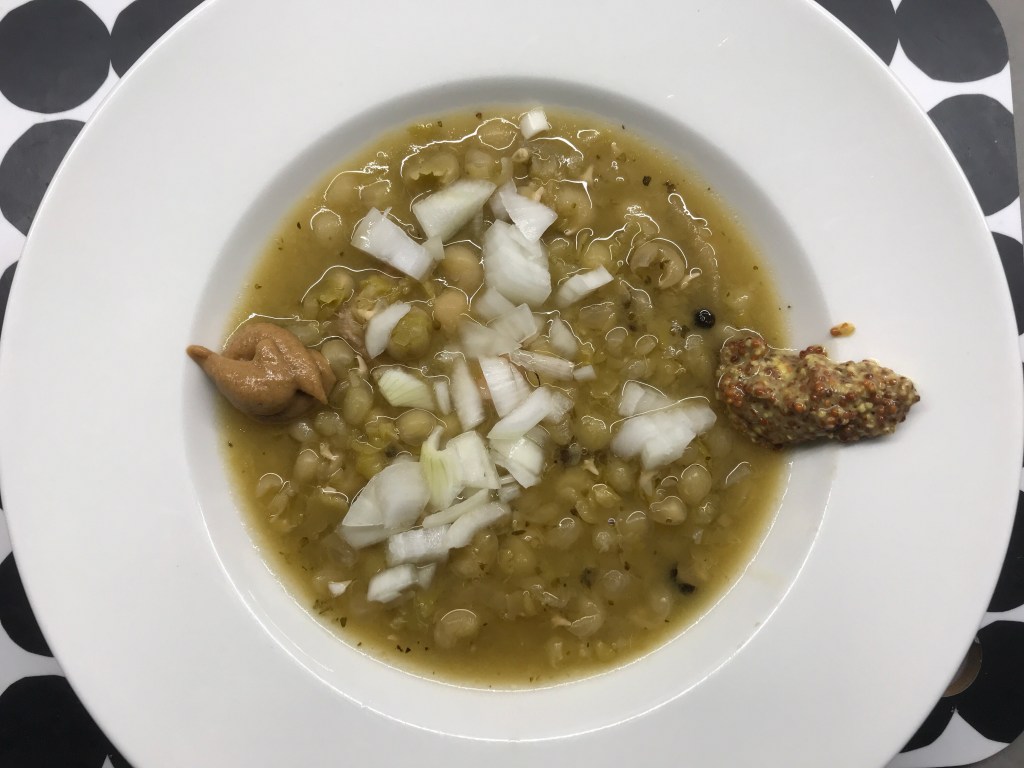 Sinapeista seuraavaa: vasemmalla on Turun väkevää sinappia, oikealla on elintarvikemyymälästä (K-kauppa?) joskus ostettua Moutard l´Ancienne. Viime mainitun suomennos on lyhyellä ranskalla jotakuinkin, että ”muinaisaikojen sinappi”. Siinä on sinapinsiemenet kokonaisina, osa rouheena. Etikkaisuuttaan on jäänyt jääkaappiin, mutta voilá: tähän sopii kuin nenä päähän! Keitossa on myös vähän palvikinkkua, kun tänä vuonna ei kinkkua laitettu. Slirps, taidan siirtyä rokan lämmitykseen.