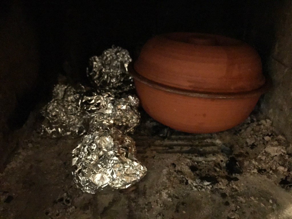 …ai nuo nytyset takassa ja saviruukku vai? Nytysissä on porkkananpaloja ja perunoita kokonaisina. Take home message: ei mennyt putkeen. Potut jäi johonkin puolitiehen, porkkanat… njääääh… Roskiin piti laittaa nekin. Saviruukussa on porkkanakeittoa, lykkäsin sen takkaan yöksi hautumaan hellalla keiton jälkeen. No jaa, eipä tullut kummemmaksi.