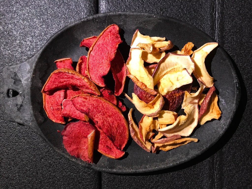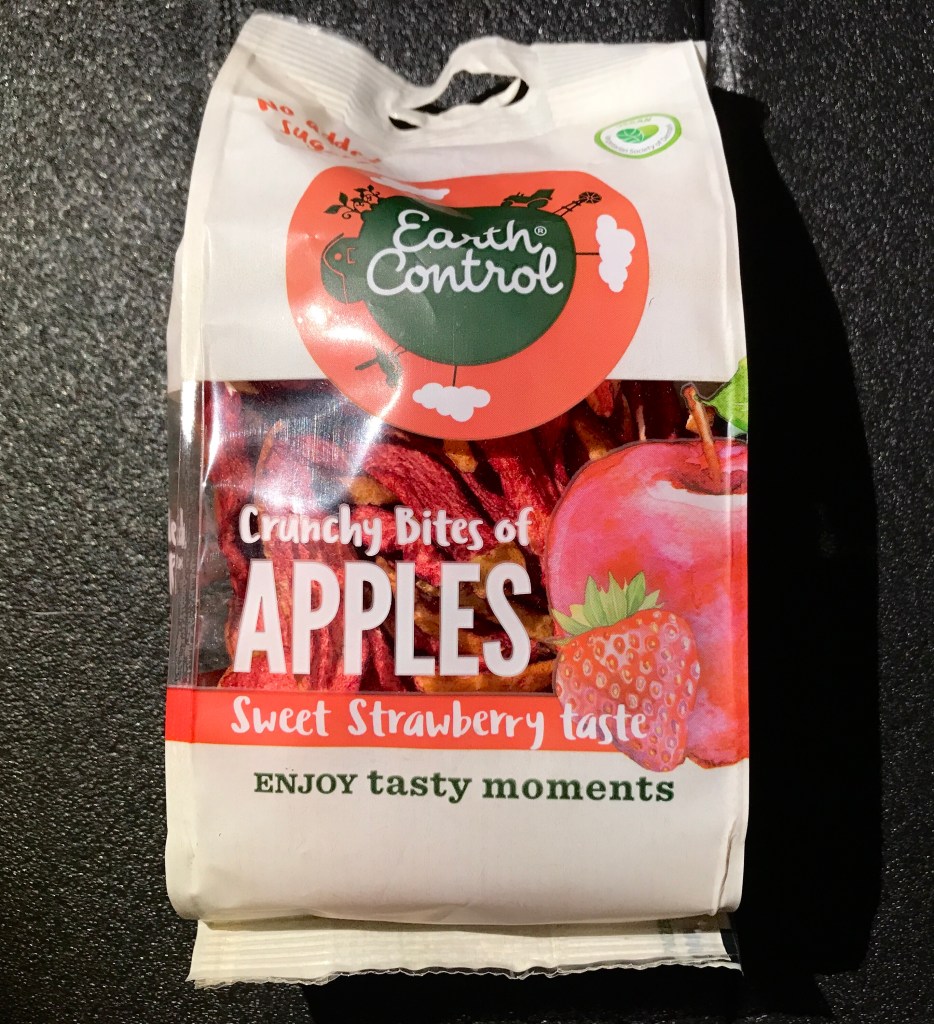 Menossa on kuivattujen omenoiden vertailutesti. Tarkastelun kohteena kaupan ”Earth Control”-firman (tanskalainen?) mansikka-aromilla terästetyt omenalastut, joita verrataan omatekoisiin. Seuraavat tulokset: