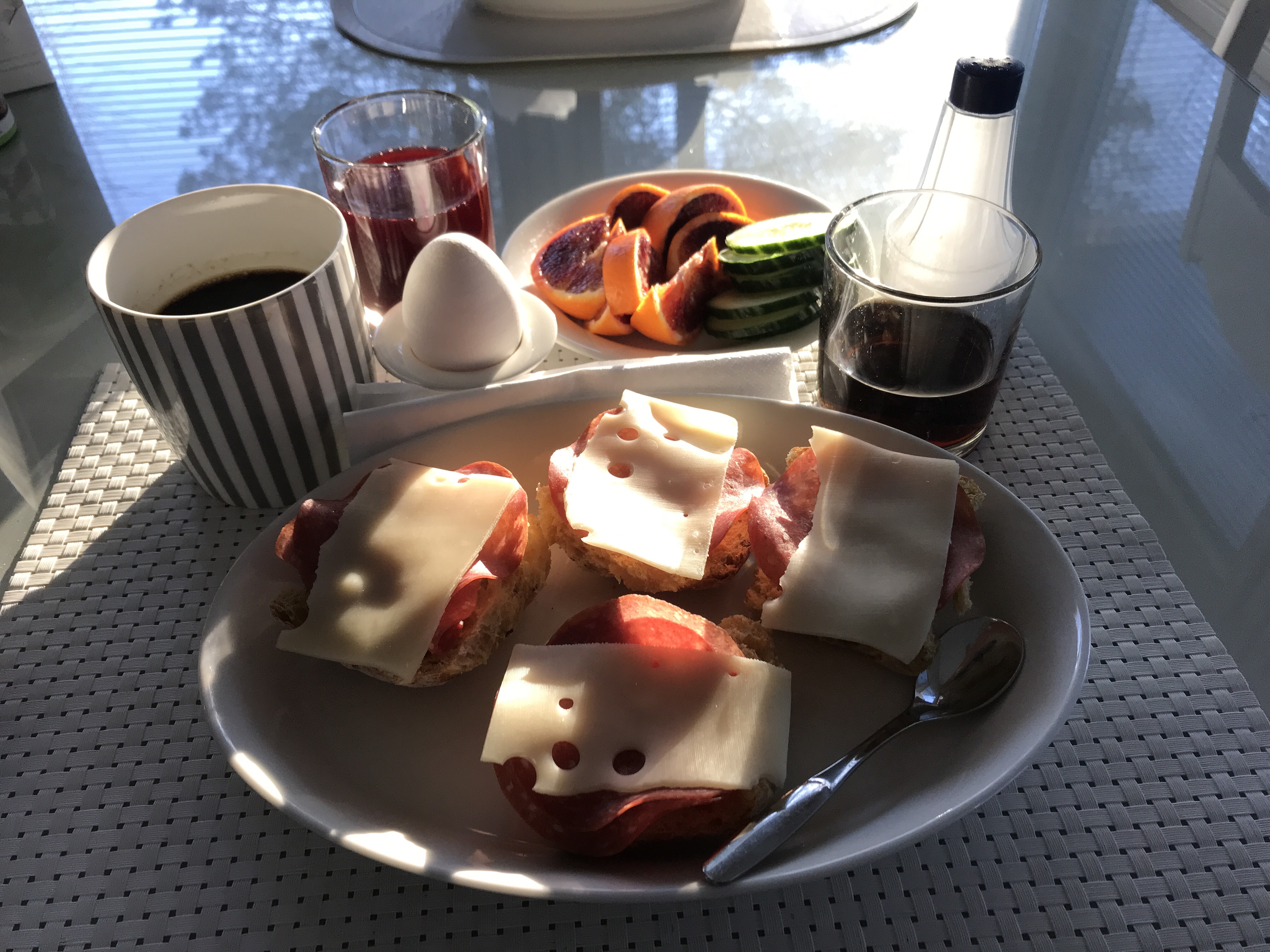 Arvelin ottaa kuvan aamiaisestani, kun näytti niin hyvältä etenkin auringonvalossa. Talonmies oli jo loikkinut nettilehtien pariin, joten omassa ylhäisyydessä sai tuumailla elämäänsä. Kylläpä tämä elämän renkutus käy laatuun, käyhän se. (Aleksi Kiveä mukaellen)