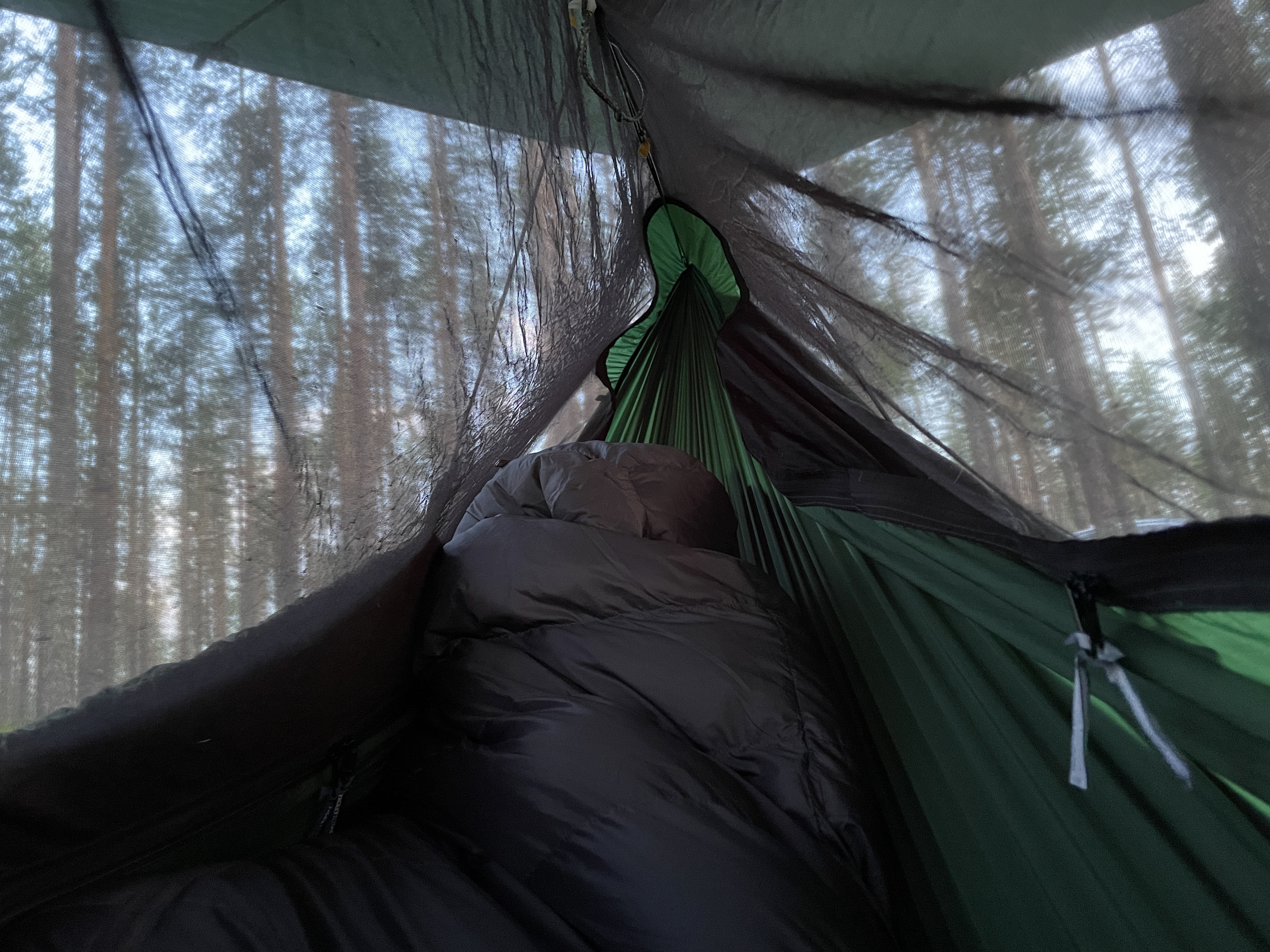 Saateri, etten asentanut alleni uutta Cumulus Selva-aluspeittoani. Mun ensimmäinen aluspeittohankinta oli DD Hammocksin keinokuituinen peitto, siis se, joka tulee riippumaton alapuolelle ikään kuin toiseksi pussiksi. Tämä DD jättää seljän viileäksi. Nyt jos mä kömyän tästä hyvästä asennosta sitä virittämään, on susien konsertti ohi sillä välin. Enkä mä oikein viittiskään. Mutta yöllä voi perspuolelta tulla vilu ja on vetäydyttävä torppaan. Nuoretpojat väitti, että ”no mää kyllä ainaki oon tarennu sillä kovassaki pakkasessa!” Mää siihen, että ole vaan, mutta sä et ookaan vanha täti. Ne ihan että no mitä se muka vaikuttaa. Nooo, ei kannattanu ryhtyä selittämään. Ei ne ois tajunnu kumminkaan.