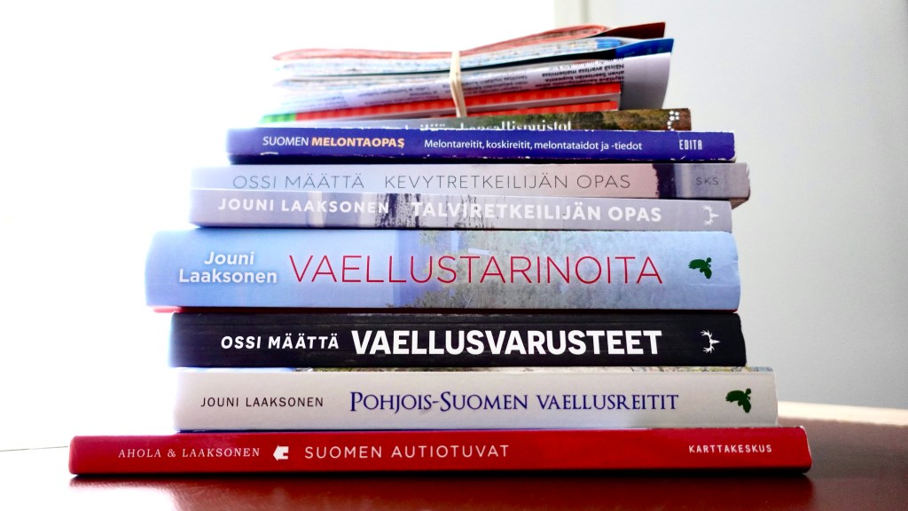 Retkikirjallisuudesta. Tuossa kuvassa on kirjapinkka, joista yhden kirjoittajan olen saanut kunnian tavata. Nämä häiskät ovat laajat tietonsa kasanneet muiden hyödyksi, respect! Ossi Määtän kirjoissa on keskeistä tietoa niin laajalta alueelta, että päätä huimaa! Jouni Laaksonen on kokenut konkari ja nähnyt ison urakan muun muassa autiotupien kartottamisessa. Näitä kirjoja lukee ilokseen, vaikka kulkisi vain lähipuistossa. Ja yliviivaan heti tuon ”vain”-sanan, sillä lähipuistossa kulkeminenkin on hienoa! Kaikkien ei tarvi suksia Sarekkiin. https://fi.wikipedia.org/wiki/Sarek