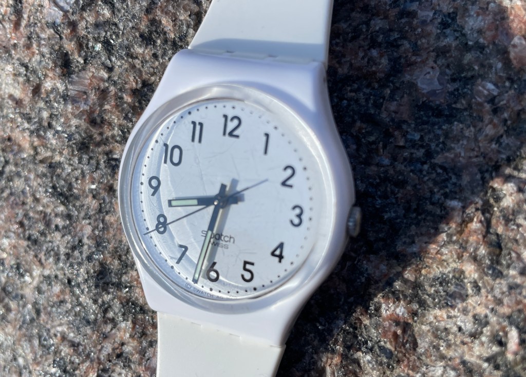 Nääs astelin paikalliseen kelloliikkeeseen, vanhaan ja arvostettuun…Viattomana asiakkaana pujahdin puotiin kyselemään arvokkaan näköiseltä, kolmikymppiseltä myyjältä aikarautaa. Veteli esiin kellotarjottimia, joilla makasi käsiraudoista mallia ottaneita jättiläiskelloja. Hintalapussa luki kolmesataa ja viisisataa. Yhdestä KELLOSTA! Selitin tarvitsevani peruskelloa. Siis semmoista, jonka voi vaikka pestä juuriharjalla tai pudottaa järven pohjaan ilman hermoromahdusta.