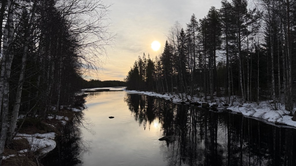 Aamukoleus hyödytti autoilijaa. Savilillu oli vielä jähmeää ja tie tulomatkaan nähden helpompi ajettava. Takaraivoon nousi ajatus palaamisesta mökille. Oli pysähdyttävä sillalle miettimään. Mutta tiesin paikallisen traktorimiehen häipyvän vetopelinsä ääreltä viimeistään maanantaina ja koira oli päästävä hakemaan hoitolasta, niin jatkoin päättäväisesti ajamista – peräti parisataa metriä. Sen jälkeen olikin jo noustava autosta ja palattava jalkapelissä takaisin sillalle ottamaan tuota kuvaa. Mikä upean kuulas ja raikas aamutunnelma! Joelta nousi kaksi vesilintua, takana kohisi jokakesäinen vesilintuperheen majapaikka, pieni koski. Katselin ja kuulostelin ja odotin pääsiäistrullin lentävän luudalla tuomaan jatkotoimien osalta kirjallista päätöstä mustan hameen sivutaskussa. Oli ihan pääsiäisfiiliskin.