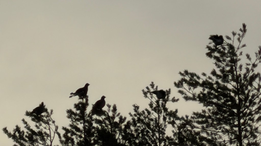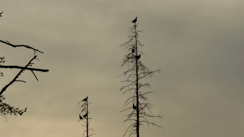 Auton vieressä savisia saappaita putsaillessa kuului siipien kohinaa. Valtava teeriporukka lehahti hakkuuaukion leveydeltä latvuksiin ja raiskiolle jätettyihin, pystyyn kuolemassa oleviin petäjiin.