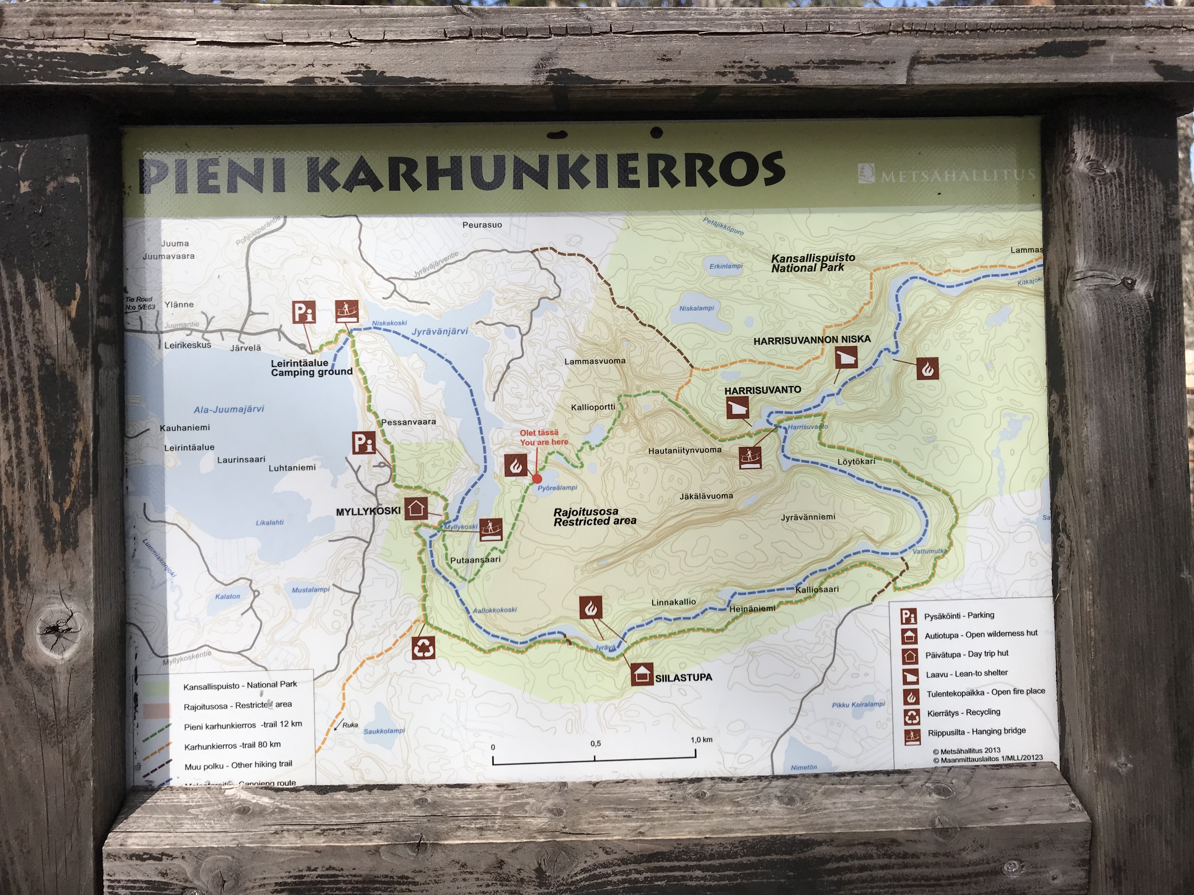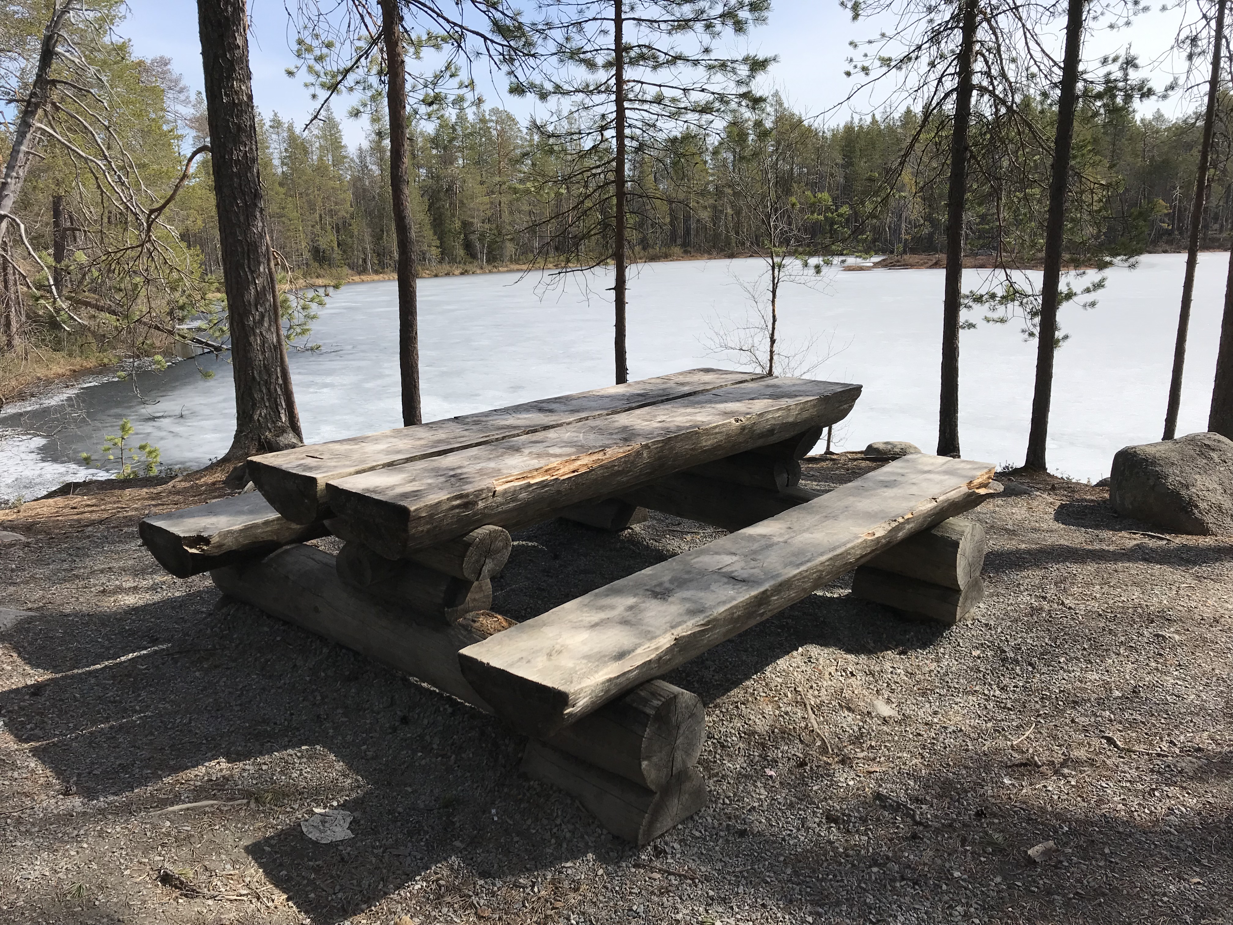 Jospa kevätauringon lämpö antaisi rohkeutta yöpyä ulkona, kun aamusella voi nousta auringonkiloon luitaan sulattelemaan. Vai täytyykö taas tyytyä kesäretkeilyyn. Lukija muistaa hartaat suunnitelmani ja grammanviilaukset viime keväänä. Juttuhan pätkittyi lyhyiksi jotoksiksi, kun suunniteltu lomajakso meni vaelluskohteen tulviessa vieden osan polkusilloista paikoiltaan ja vesi lainehti leiripaikoilla. Vaan sain jotain tehdyksikin, jopa Karhunkierrosta. Siellä tosin keli sattui semmoiseksi, etten edes melontareissuilla ole niin perusteellisesti päässyt kastumaan, enpä likikään. Karhunkierros oli sitä mitä olen tottunut siltä odottamaan. (miettii) Tai ei – sakkia oli vieläkin enemmän, ulkomaalaisia varsinkin. Ja irtokynsillä sonnustautuneita naisporukoita.
